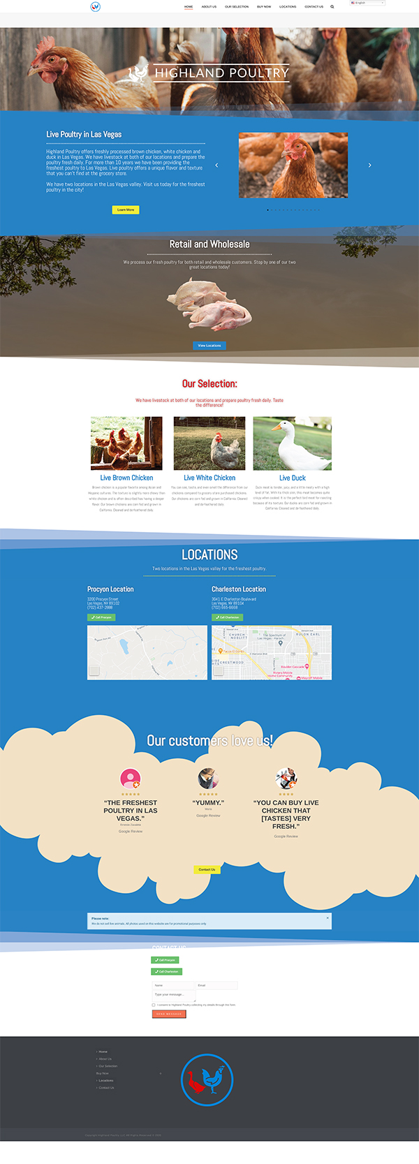 Highland Poultry is a company located in Las Vegas, Nevada that specialises in freshly processed live brown chicken, white chicken and duck. This project included logo design and full website design.